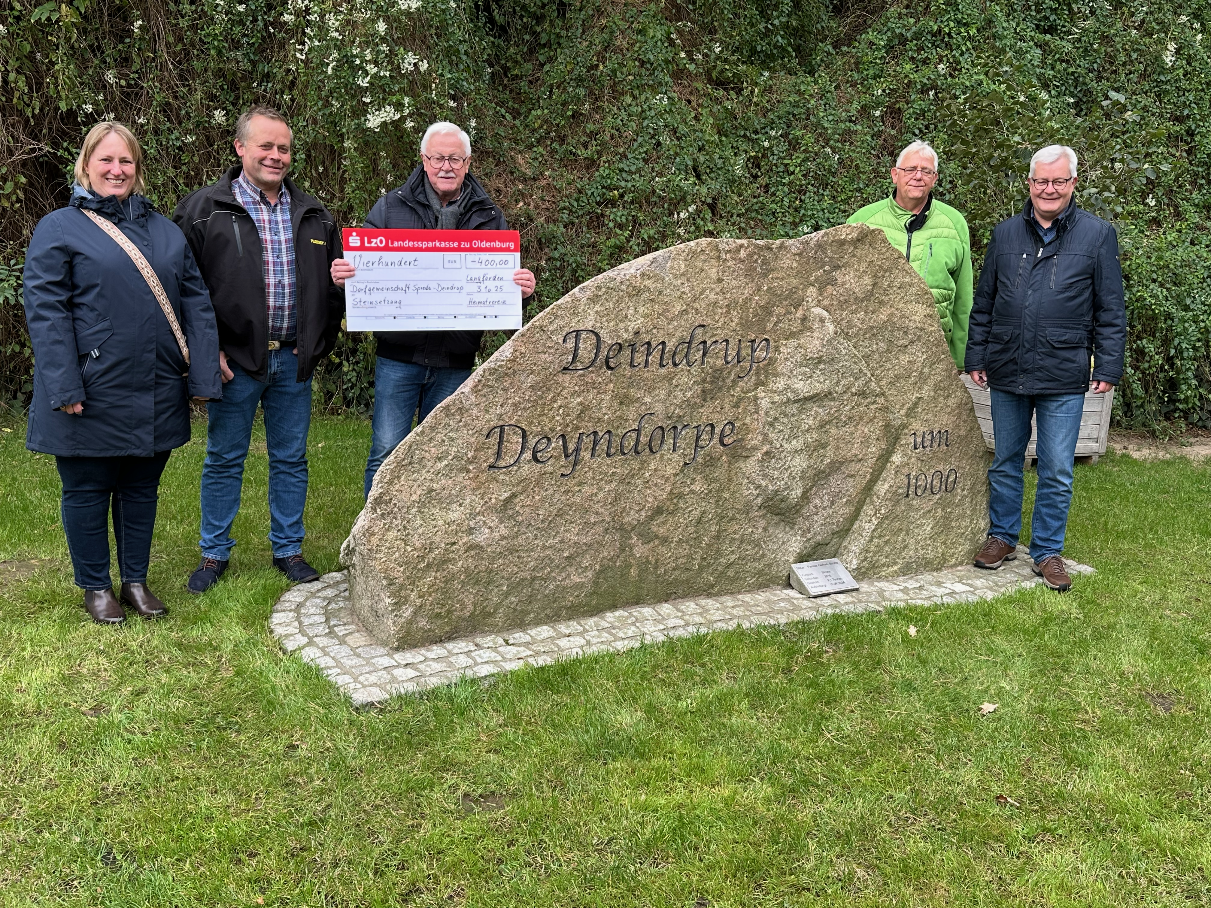 In seiner anschließenden Rede würdigte Rolf Wichmann die Entwicklung, die Spreda und Deindrup in den vergangenen Jahren genommen haben. „Was hier an Gemeinschaftsgeist, Eigeninitiative und Tatkraft gezeigt wird, ist kaum zu übertreffen“, betonte der stellvertretende Ortsbürgermeister. Auch Christof Pekeler, Vorsitzender des Langfördener Heimatvereins, zeigte sich beeindruckt und überreichte einen Spendenscheck über 400 Euro, um die noch offenen Kosten zu decken. Drei örtliche Unternehmer, die namentlich nicht genannt werden möchten, erklärten sich spontan bereit, den restlichen Betrag zu übernehmen.