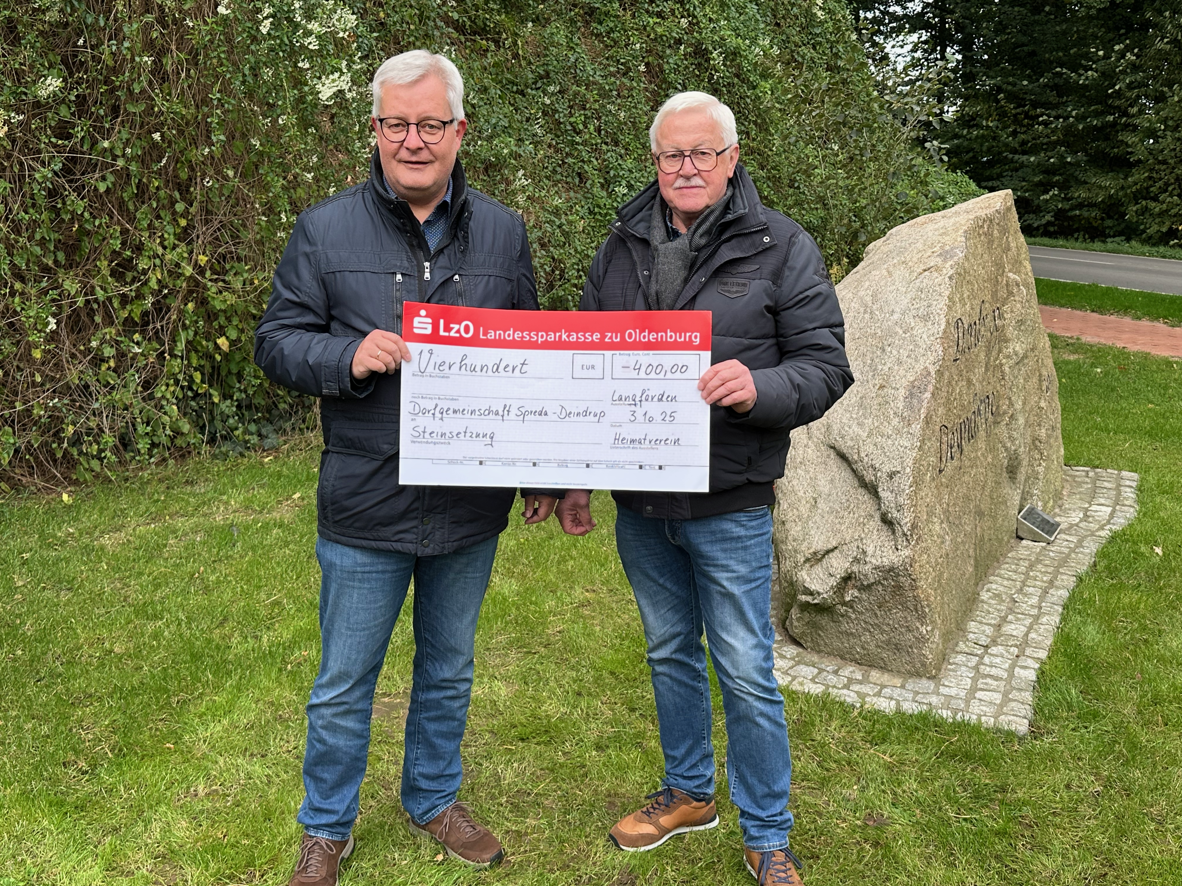 In seiner anschließenden Rede würdigte Rolf Wichmann die Entwicklung, die Spreda und Deindrup in den vergangenen Jahren genommen haben. „Was hier an Gemeinschaftsgeist, Eigeninitiative und Tatkraft gezeigt wird, ist kaum zu übertreffen“, betonte der stellvertretende Ortsbürgermeister. Auch Christof Pekeler, Vorsitzender des Langfördener Heimatvereins, zeigte sich beeindruckt und überreichte einen Spendenscheck über 400 Euro, um die noch offenen Kosten zu decken. Drei örtliche Unternehmer, die namentlich nicht genannt werden möchten, erklärten sich spontan bereit, den restlichen Betrag zu übernehmen.